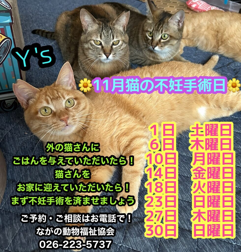 猫の手術日 11月の猫の不妊手術日の日程 2025年10月16日 by doufuku 室内で暮らす子も お外で暮らす子もご相談ください! ご予約・お問い合わせはお電話でお願い致します NPO法人ながの動物福祉協会☎︎026-223-5737 外で猫が増え過ぎると人と人とのトラブルも増え矛先は猫に向けられます また、室内で猫が増え過ぎても人も猫も穏やかな暮らしが困難になりますメス猫もオス猫も不妊手術を済ませていただき人間の都合で手術させてもらった猫さん達をその後も見守りお願い致します 餌やりと不妊手術はセットで !!